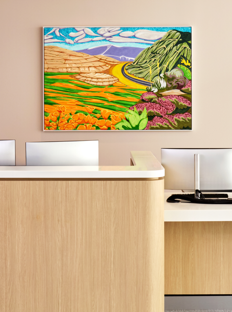 A strong example of this is our work with Kaiser Permanente at the Watts Counseling and Learning Center. Here, we featured colors and styles that may feel unexpected in healing environments, including bright reds and oranges, abstract compositions, and energetic visual language.