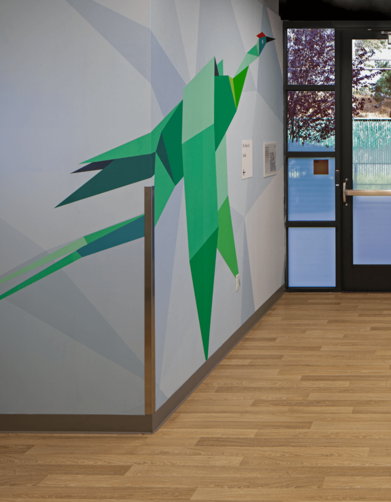 By focusing on locally relevant nature and interpreting it in ways that speak directly to each audience, we’re able to present biophilic patterns, colors, and content that feel authentic rather than expected. For example, in a children’s waiting room at Kaiser Permanente Playa Vista Medical Offices, we featured playful egrets and herons found locally. Our in-house graphic artists designed polygonal forms with whimsical flight patterns that children could trace with their fingers as they followed the artwork across the wall.
